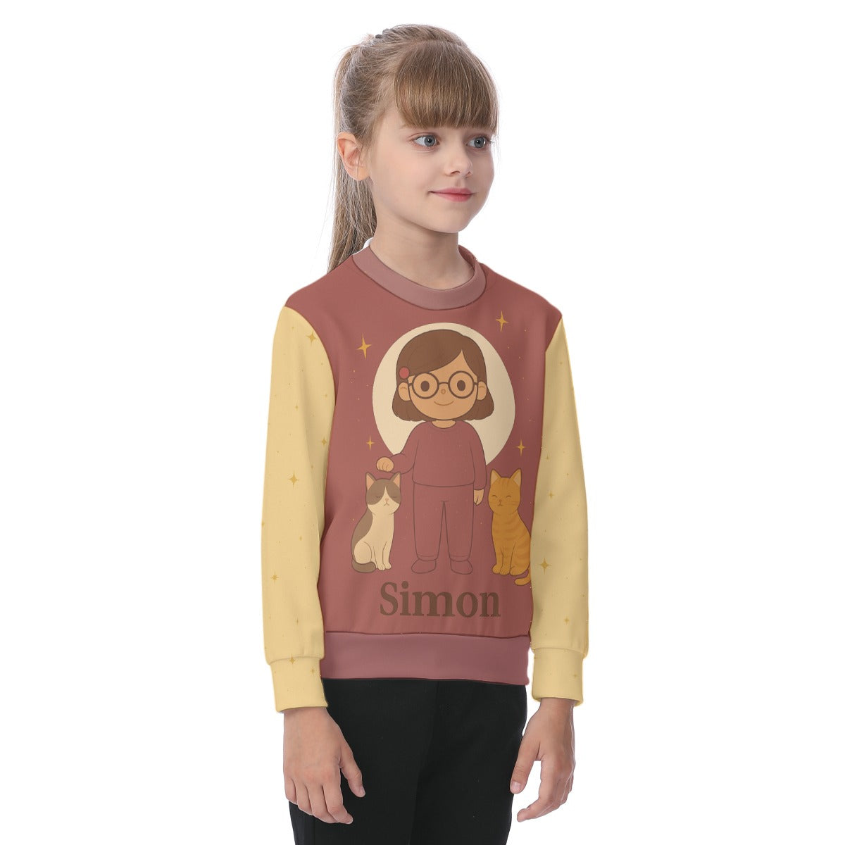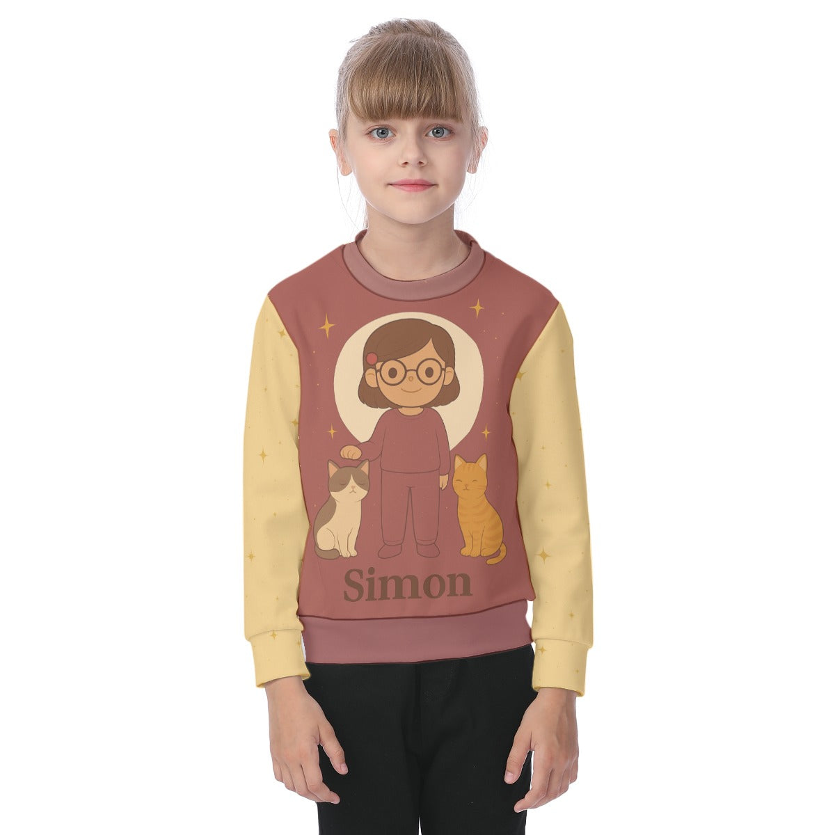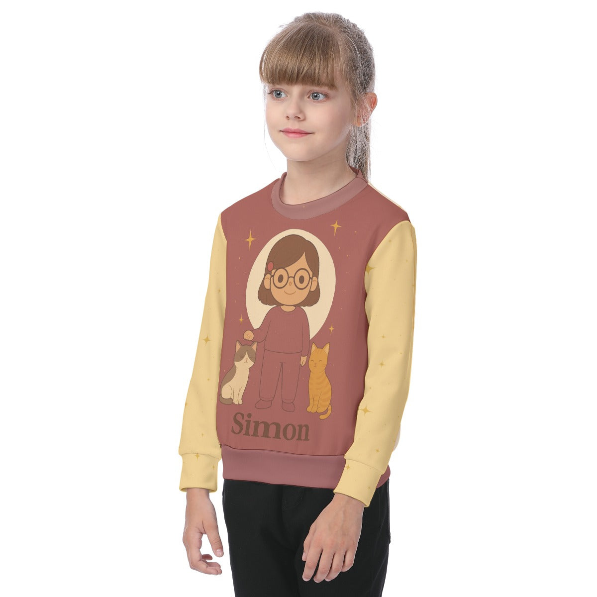 Ce magnifique chandail pour enfants met en vedette Simon, le personnage adorable, accompagné de son petit chat. Parfait pour les enfants de 2 à 12 ans, ce sweat-shirt confortable offre une coupe décontractée qui permet aux enfants de bouger librement.