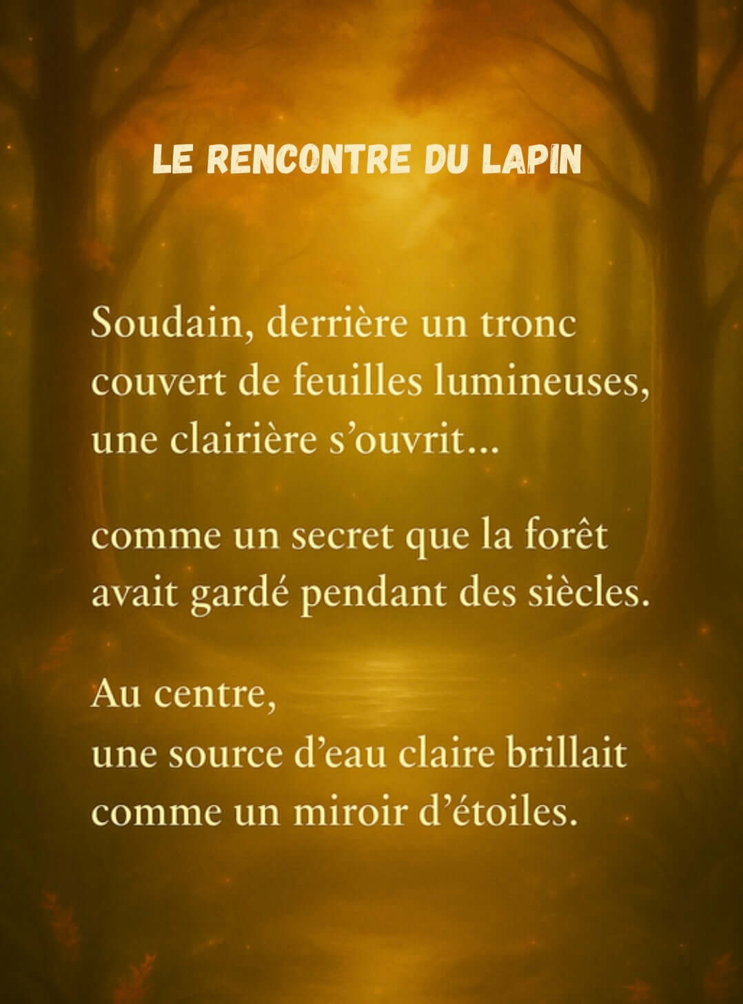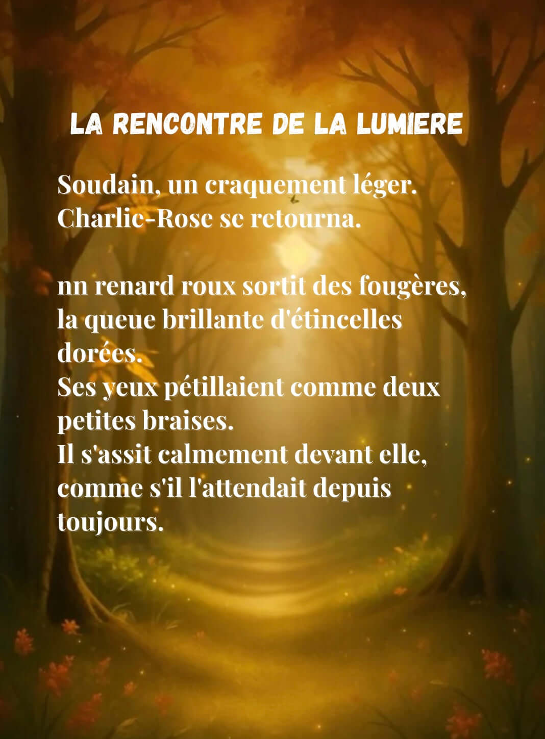 Guidée par ses amis — le renard lumineux, le lapin au pelage étincelant, le chat curieux et l'ours bienveillant — Charlie-Rose explore un monde où chaque arbre murmure une histoire et où chaque rayon doré cache un secret.