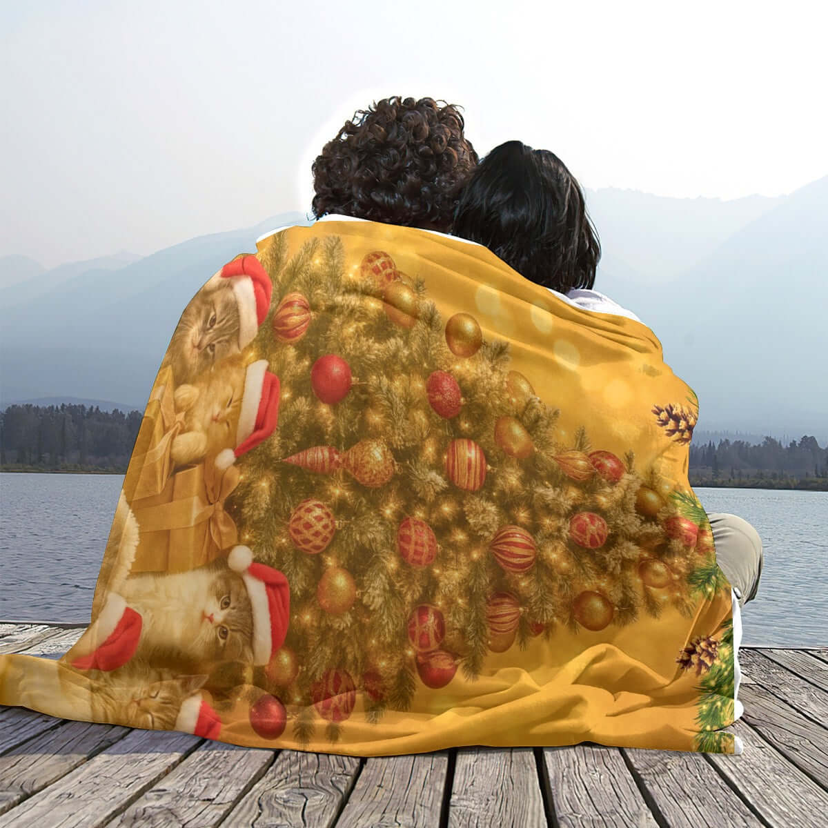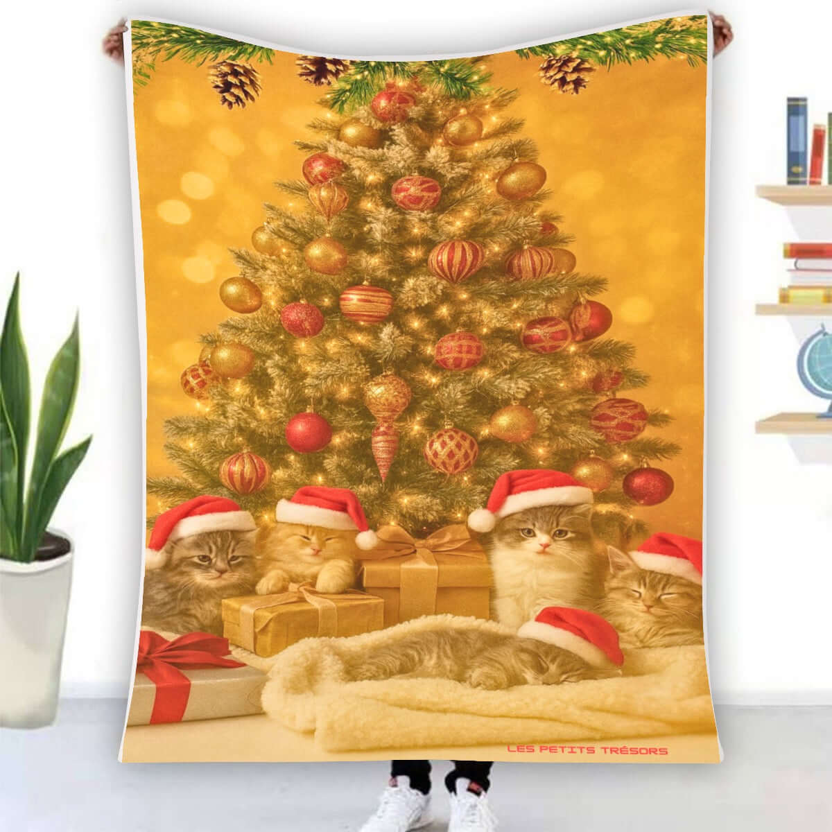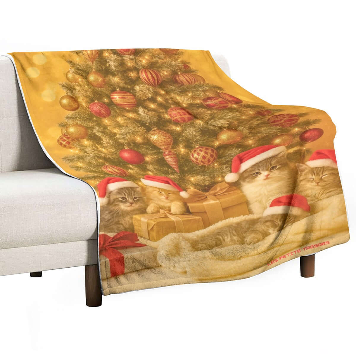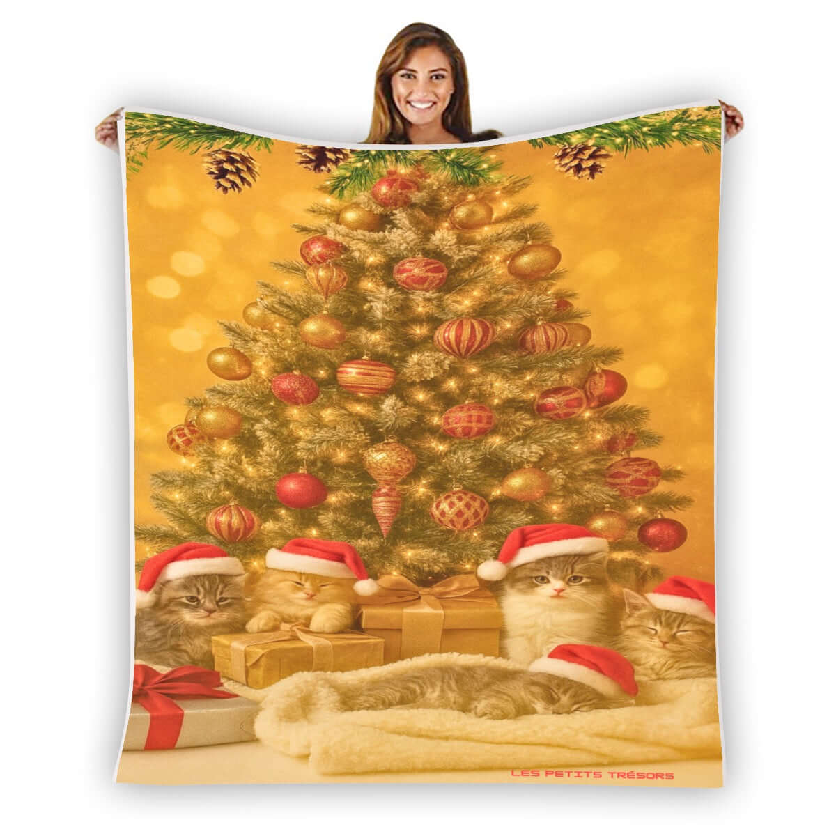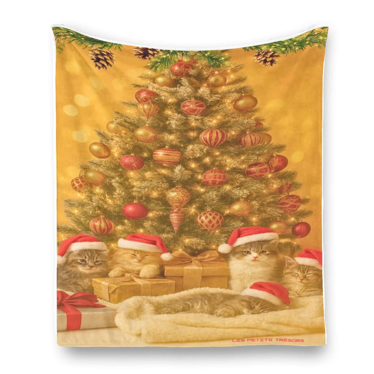 Apportez la magie de Noël dans votre maison avec cette magnifique couverture en flanelle douce mettant en vedette un adorable chaton devant un sapin de Noël décoré.